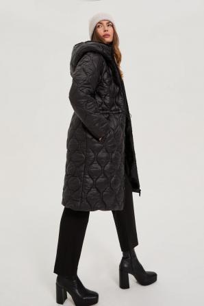 100% POLYAMID, PODŠÍVKA: 100% POLYESTER. Tato prošívaná zimní bunda v klasické černé barvě je spolehlivou volbou pro mrazivé dny. Hladký, nevzorovaný povrch zdůrazňuje univerzální atraktivitu produktu, zatímco výrazné prošívání a dekorativní prošívání jí dodávají moderní styl. Praktická kapuce lemovaná měkkou kožešinou z medvídka poskytuje dodatečnou ochranu před chladem a útulnost. Bunda má praktický zip po celé délce, funkční kapsy a elastické manžety, které účinně těsně těsně udržují vítr. Dlouhé rukávy a střih po kolena zajišťují pohodlí i při velmi nízkých teplotách. Vnitřek bundy ukrývá pečlivě vybranou podšívku a izolaci na bázi polyamidu, což má za následek lehké pohodlí a vynikající tepelnou izolaci. Ideální pro zimní procházky, každodenní výlety do práce nebo víkendové pobyty. Dobře se hodí ke klasickým džínům, pleteným šatům a ležérním kalhotám. Hodí se k zimním botám a vašim oblíbeným doplňkům a vytváří tak vzhled plný pohodlí a elegance. Zimní bunda s kapucí je nezbytností v zimním šatníku každé ženy.