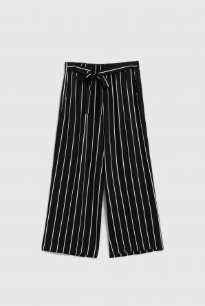 100% VISKÓZA Černé pruhované culottes jsou návrhem, který vyniká módním střihem se širokými nohavicemi 7/8. Vysoký pas a elastický pas poskytují pohodlí po celý den a ozdobný pásek zdůrazňuje postavu a dodává stylový akcent. Praktické kapsy umožňují pohodlné uložení drobností. Lehká, prodyšná viskóza ve složení zaručuje potěšení z nošení a vzdušnost. Culottes jsou ideální pro každodenní schůzky nebo venčení s přáteli. Perfektně se hodí k bílé košili, klasickému tričku nebo krátkému topu a mokasínům, teniskám nebo sandálem na podpatku. Vytvoří efektní základ pro elegantní, ležérní nebo městský vzhled.