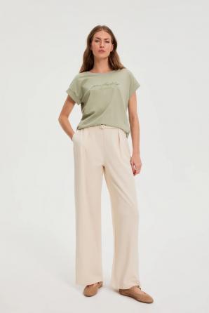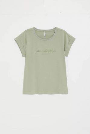 95% BAVLNA, 5% ELASTAN Tato olivová halenka s potiskem je synonymem pohodlí a moderního stylu. Jemná, hebká látka je příjemná na dotek a jednoduchý střih vám umožní cítit se pohodlně po celý den. Krátké rukávy dodávají nádech lehkosti, zatímco minimalistický potisk zdůrazňuje individuální charakter stylu. Olivová barva se dobře hodí k mnoha doplňkům a vnáší do vašeho každodenního šatníku svěžest a decentní eleganci. Ideální na setkání s přáteli, do práce nebo na víkendovou procházku. Perfektně se hodí k džínům, lehkým kalhotám, ležérní sukni nebo pod klasické sako. Tato halenka se dobře hodí k ležérním outfitům i jako základ pro elegantnější outfity. Pohodlná, stylová a všestranná – pro ženy, které si cení přirozeného vzhledu a módního každodenního stylu.
