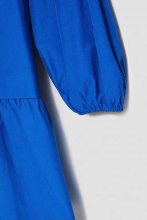 Střih od pasu, dole dva velké volány. Klasický límec pod krkem.