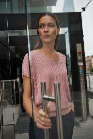 80% VISKÓZA, 20% METALICKÁ NIT. Tento svetr s krátkým rukávem, vyrobený z viskózy v jemném odstínu růžové, zaujme svou lehkostí a ženským charakterem. Žebrovaný úplet s jemnou metalickou nití dodává nádech decentního třpytu a zdůrazňuje váš individuální styl. Volný střih se spuštěnými rameny a výstřihem do V vytváří pohodlnou, uvolněnou siluetu a umožňuje volnost pohybu po celý den. Měkká, příjemná látka na dotek promění každodenní styling v potěšení. Ideální volba do práce, na kávu s kamarádkou nebo na večerní procházku městem. Svetr se krásně hodí k elegantním kalhotám, klasické sukni, volným džínům nebo pod sako. Strukturovaný vzor a růžová barva vnesou do vašeho šatníku svěžest a spojují ležérní pohodlí s ženskou elegancí.