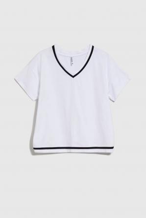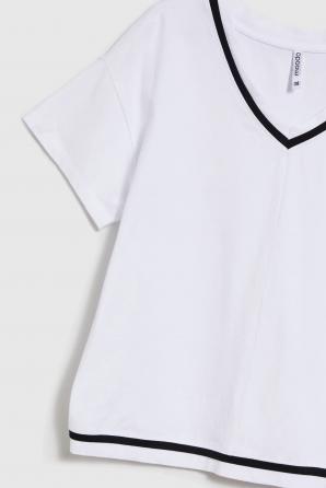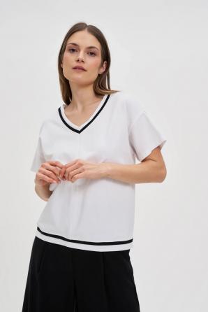 95% BAVLNA, 5% ELASTAN Bílá halenka, bez vzoru, z hladké bavlny. Má ozdobný výstřih, krátké rukávy a volný střih. Ideální pro mnoho příležitostí. Je ideální jak pro každodenní použití, tak pro setkání s přáteli. Hodí se k džínám, sukním i elegantním kalhotám.