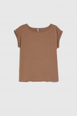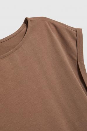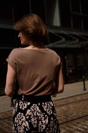 Tato dámská halenka v hnědých odstínech je perfektní volbou pro každodenní styling. Hladká a nevzorovaná, zaujme svým minimalistickým designem, který zdůrazňuje všestrannost a nadčasový charakter. Volný střih se spuštěnými rameny zaručuje volnost pohybu a pohodlí po celý den, zatímco lodičkový výstřih decentně zvýrazňuje dekolt a dodává siluetě nádech lehkosti. Vyrobena z měkké, příjemné bavlny na dotek, zajišťuje prodyšnost a pohodlí i v horkých dnech. Perfektně se hodí k džínům, kraťasům nebo sukním a vytvoří tak módní a pohodlné outfity pro každou příležitost.