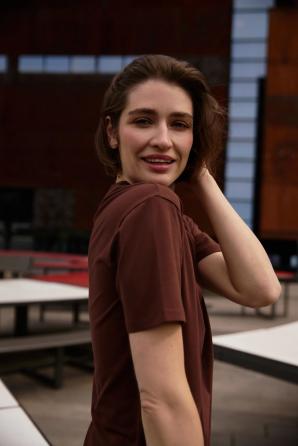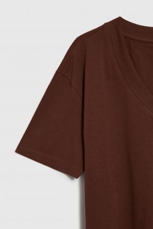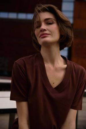 95% BAVLNA, 5% ELASTAN. Tato hnědá halenka s hladkou texturou přitahuje pozornost svým minimalistickým designem a všestranností. Volný střih zajišťuje volnost pohybu a pohodlí po celý den, zatímco krátké rukávy jsou ideální pro teplejší dny. Výstřih do V decentně zdůrazňuje krk a dodává halence lehký a ženský nádech. Přírodní, měkká bavlna zaručuje příjemný pocit na pokožce a pohodlí i při intenzivní aktivitě. Ideální pro každodenní nošení, procházku městem nebo setkání s přáteli. Hodí se k džínům, kraťasům nebo midi sukni. Skvěle se hodí i jako základ pod sako nebo svetr a vytváří tak stylový a ležérní vzhled.