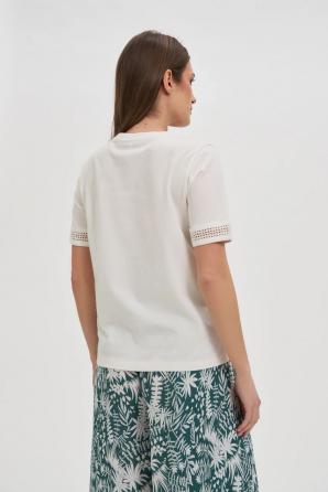 100% BAVLNA Krémová halenka potěší decentní kombinací hladké bavlny a jemné krajky, která jí dodává jedinečný charakter. Krátké rukávy a volný střih zajišťují pohodlí a volnost pohybu, zatímco kulatý výstřih zdůrazňuje ženskou siluetu. Přírodní bavlna zaručuje pohodlí a prodyšnost, zatímco dekorativní detaily zdůrazňují moderní styl. Je ideální pro každodenní použití, stejně jako pro setkání s přáteli nebo do práce. Perfektně se hodí k džínům, elegantním kalhotám, pouzdrovým sukním a klasickým sakům, čímž vytváří módní a univerzální styly.