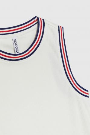 95% BAVLNA, 5% ELASTAN Tento ecru top je určen pro ženy, které si cení nadčasové klasiky a pohodlí. Jemná, hladká bavlna zajišťuje příjemné nošení po celý den, zatímco decentní ozdobná páska dodává nádech lehkosti a svěžesti. Klasický střih lichotí siluetě, zatímco kulatý výstřih krásně zvýrazňuje krk. Top je ideální jak pro dynamický den plný výzev, tak pro klidné chvíle doma. Všestrannost tohoto střihu umožňuje vytvářet mnoho stylů – v kombinaci s látkovými kalhotami se perfektně hodí do kancelářského dress code, s džínami vytváří pohodlný každodenní look a s lehkou sukní získává ženský, romantický charakter. Tento ecru top bez rukávů je perfektním doplňkem šatníku moderní ženy, která kombinuje styl s pohodlím, bez ohledu na příležitost.