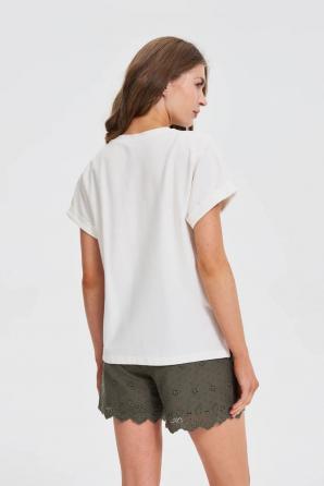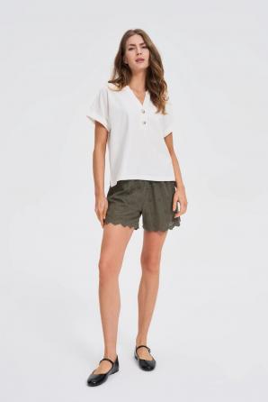 100% BAVLNA Halenka v bílém odstínu je perfektní volbou pro milovnice decentní elegance a pohodlí. Hladký, bez vzoru, potěší minimalistickým stylem, který krásně zdůrazňuje přirozenost. Krátké rukávy a volný střih zajišťují volnost pohybu a prodyšnost, zatímco výstřih do V se stojáčkem decentně prodlužuje krk a dodává siluetě lehký nádech. Knoflíky u výstřihu jsou jemným doplňkem, který zpestřuje celek a dodává mu jedinečný charakter. Bude se hodit jak pro každodenní použití, tak i pro schůzky s přáteli či do práce, kde se počítá s pohodlím a stylem. Perfektně se hodí k džínům, elegantním látkovým kalhotám a rovně střiženým sukním. Halenka se skvěle hodí k saku nebo kardiganu a vytváří tak nadčasový a módní vzhled pro mnoho příležitostí.