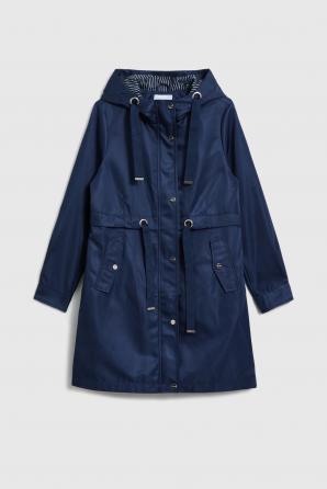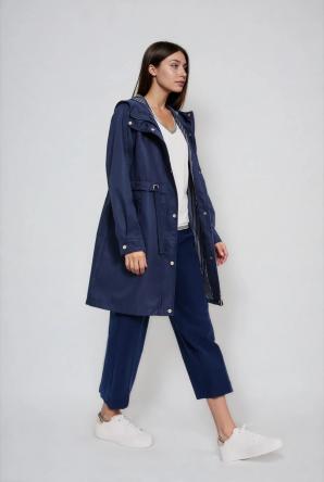 Tato tmavě modrá bunda je ideální pro ženy, které si cení pohodlí a moderního stylu. Hladká podšitá látka pohodlně obepíná tělo, zatímco volný střih s dlouhými rukávy a praktickou kapucí je ideální pro každodenní nošení. Zip, kapsy a zavazování v pase umožňují snadné přizpůsobení bundy vaší postavě a dodávají jí lehký a ležérní vzhled. Manžety zajišťují pohodlí i v chladnějších dnech. Ideální na procházku po městě, do práce nebo na setkání s přáteli – délka nad kolena se dobře hodí jak ke kalhotám, tak k sukni. Bunda snadno doplní ležérní outfity, ale i elegantnější styly v kombinaci s klasickými džínami nebo jednoduchými šaty. Díky své všestrannosti je univerzálním základem pro mnoho každodenních outfitů, zdůrazňuje ženský styl a zajišťuje každodenní pohodlí.