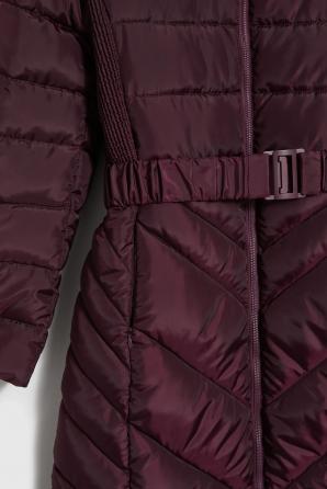 100% POLYESTER, PODŠÍVKA: 100% POLYESTER. Tato prošívaná zimní bunda v odstínech vínové se vyznačuje hladkou strukturou a elegantním, minimalistickým designem. Pečlivě vyrobené prošívání a výrazné prošívání dodávají oděvu lehkou siluetu a zároveň zdůrazňují moderní charakter. Funkční kapuce poskytuje praktickou ochranu před chladem a větrem, zatímco zavazovací pásek decentně tvaruje pas a zajišťuje požadovaný střih. Dlouhé rukávy a střih po kolena účinně chrání před chladem. Zip zajišťuje pohodlné a rychlé zapínání, zatímco praktické kapsy umožňují uložení drobností. Bunda se vyznačuje příjemnou izolací na dotek, podšívkou a vnější vrstvou z odolného polyesteru. Ideální volba pro zimní procházky, každodenní výlety do práce i víkendové pobyty ve městě. Perfektně se hodí ke klasickým džínům, svetru a kotníkovým botám, ale i k pleteným šatům a kozačkám a vytváří tak stylové a ženské outfity pro chladnější dny.