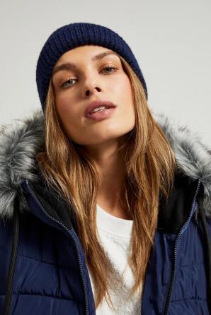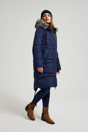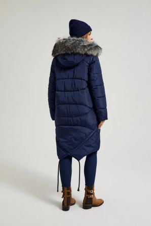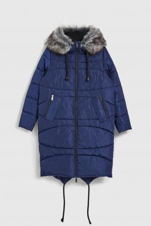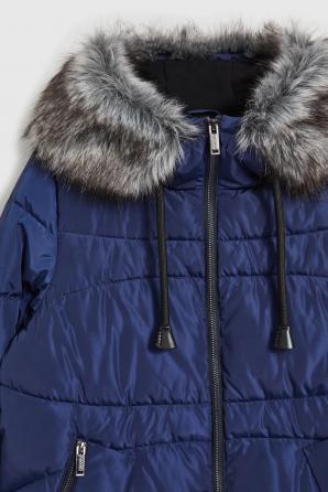 100% POLYESTER Zimní prošívaná bunda v tmavě modré barvě, ideální do chladných dnů. Vyrobeno z hladkého polyesteru, zateplené a podšité, zajišťující teplo a pohodlí. Má praktické kapsy, prošívání a kožešinu v kapuci. Zapínání na zip, sahající pod kolena, ideální do mrazivých dnů.