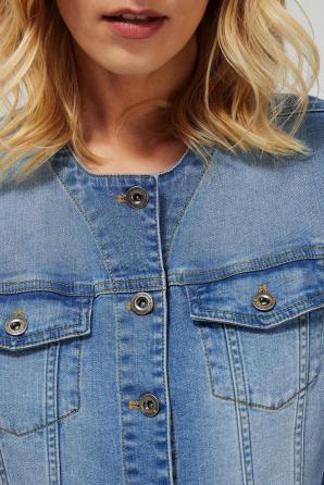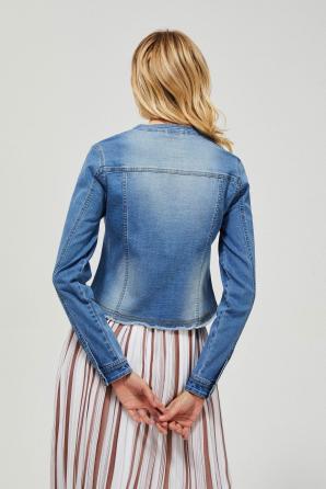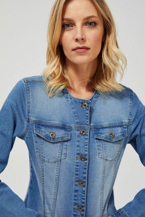 Spodní část bundy má syrovou úpravu. Zapínání na knoflíky. Modrá barva.