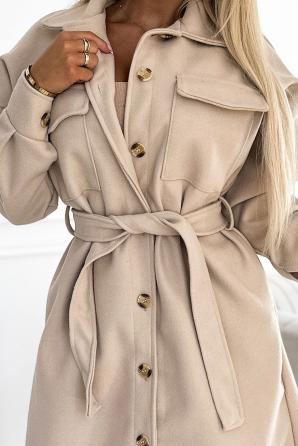 Teplý kabát s dlouhými rukávy, kapsami, knoflíky a zavazováním v pase.