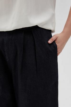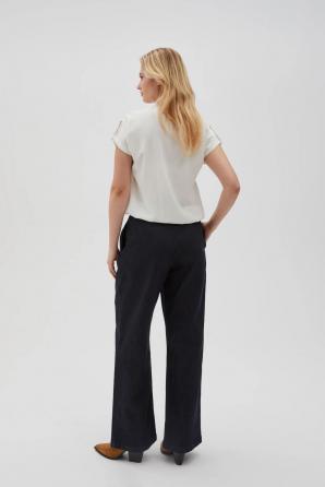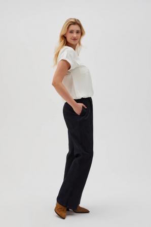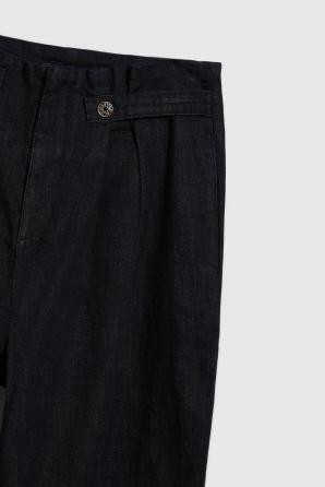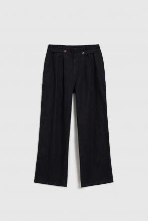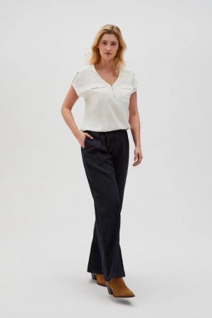 98% BAVLNA, 2% ELASTAN Dámské džíny v tmavě modré barvě, bez vzoru. Vyrobeno z vysoce kvalitní bavlny, která zajišťuje pohodlí při nošení a odolnost. Model s ozdobným páskem a širokými nohavicemi. Mají vysoký pas, který zvýrazňuje postavu. Zapínání na zip. Hodí se pro mnoho příležitostí, jak pro každodenní, tak pro formálnější příležitosti. Skvěle se hodí k bílé košili a klasickým vysokým podpatkům, stejně jako ke sportovní obuvi a volné halence.