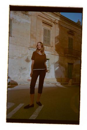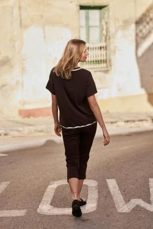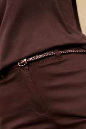 97% BAVLNA, 3% ELASTAN. Tyto hnědé capri chino kalhoty jsou synonymem pro každodenní pohodlí a styl. Hladká přírodní bavlna s přidanými strečovými vlákny zajišťuje volnost pohybu a měkkost, zatímco ozdobný pásek zdůrazňuje ženský střih. Rovné nohavice s rozparky na lemu a praktické kapsy kombinují funkčnost s módní siluetou. Zapínání na knoflíky a zip dodává eleganci, zatímco tříčtvrteční délka dodává kalhotám lehkou siluetu. Tyto kalhoty jsou ideální do práce, na schůzku s přáteli nebo na procházku po městě. Jejich všestrannost umožňuje kombinovat je s elegantním sakem, klasickou košilí, svetrem nebo volným tričkem. Stylová volba jak k podpatkům, tak k pohodlným teniskám. Je to pohodlný a módní základ, díky kterému se budete cítit pohodlně a žensky každý den.