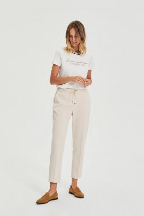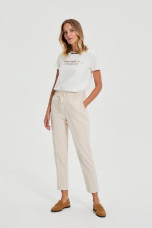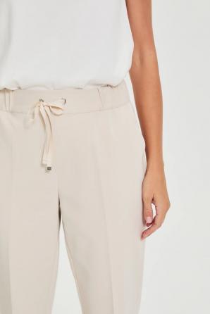 Béžové kalhoty s puky, s šikmými kapsami a v pase do gumy