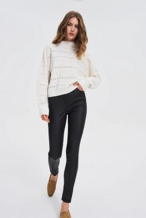 71% VISKÓZA, 25% POLYESTER, 4% ELASTAN Černé voskované skinny džíny jsou dokonalou směsicí klasiky a moderního. Hladký, nevzorovaný povrch přitahuje pozornost jemným leskem, zatímco přiléhavý střih krásně zdůrazňuje siluetu. Praktické kapsy a praktický zip zajišťují pohodlné nošení každý den. Díky přidání měkké viskózy je látka hebká na dotek a pružná, což zajišťuje celodenní pohodlí. Tento střih je ideální jak pro každodenní nošení, tak pro večerní příležitosti. Krásně se hodí k elegantní košili a podpatkům, stejně jako k volnému svetru nebo klasickému tričku a teniskám. Černé skinny džíny jsou nepostradatelným doplňkem šatníku, který dokonale doplní ležérní i formálnější outfity.