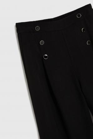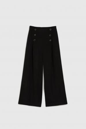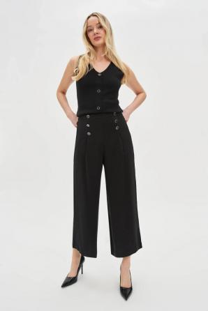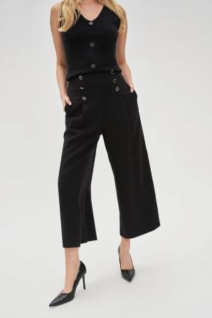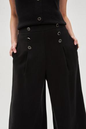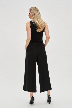 93% VISKÓZA, 7% POLYESTER Tyto černé dámské kalhoty jsou perfektní volbou pro ženy, které si cení pohodlí a stylu. Jsou vyrobeny z lehké a prodyšné viskózy a poskytují celodenní pohodlí. Široké nohavice a vysoký pas tvarují postavu, zatímco elastický pas dodává kalhotám nádech šarmu. Kalhoty mají praktické kapsy, záševky a módní střih culotte. Díky délce 7/8 jsou vhodné pro mnoho příležitostí, ať už pro každodenní nebo formálnější nošení. Dokonale doplňují elegantní i ležérní outfity a skvěle se hodí k elegantní halence, svetru nebo tričku.