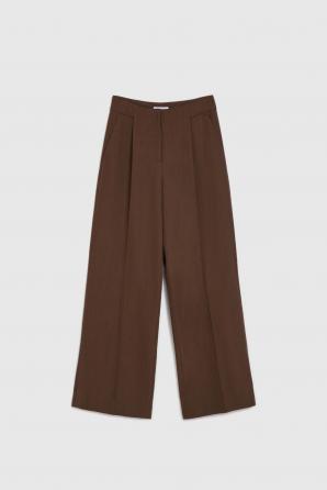 95% POLYESTER, 5% ELASTAN Tyto široké kalhoty v tmavě hnědém odstínu jsou módní volbou pro ženy, které si cení pohodlí a volnosti pohybu. Hladká textura a lehká směs polyesteru zajistí, že každý den bude bez námahy, zatímco stylová silueta zdůrazňuje ženskou siluetu. Praktické zapínání na zip dodává pohodlí a decentní moderní nádech, díky kterému se budete cítit sebevědomě v každé situaci. Tyto hnědé široké kalhoty jsou ideální pro každodenní nošení do práce, víkendovou procházku nebo schůzku s kamarádkou. Perfektně se hodí ke klasické bílé košili, měkkému svetru nebo ležérnímu saku a vytvářejí elegantní a zároveň ležérní vzhled. Všestranný design umožňuje hravé doplňování – jak sportovní tenisky, tak kotníkové boty zdůrazní jejich jedinečný styl.