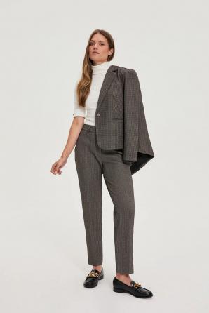 68,3 % POLYESTER, 20,7 % VISKÓZA, 8 % METALICKÁ NIT, 3 % ELASTAN Tyto béžové cigaretové kalhoty s motivem rybí kosti okouzlují svou elegancí a nadčasovým stylem. Pečlivě navržený záhyb zeštíhluje siluetu, zatímco praktické kapsy zdůrazňují funkčnost modelu. Dlouhý, mírně zúžený střih vytváří elegantní a moderní vzhled, zatímco klasické zapínání na zip a knoflík zajišťuje pohodlné nošení. Lehká, měkká polyesterová tkanina zajišťuje celodenní pohodlí. Ideální pro obchodní schůzky, výlety do práce nebo elegantní formální události. Perfektně se hodí ke košili, přiléhavé bundě nebo svetru. Efektně doplní klasický outfit s jehlovými podpatky nebo mokasíny a vytvoří tak vždy módní a ženský vzhled.
