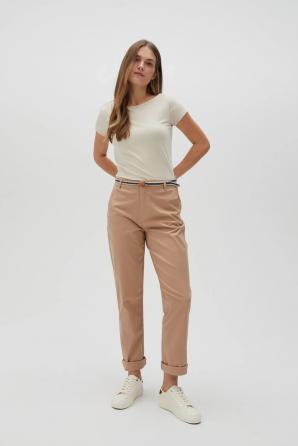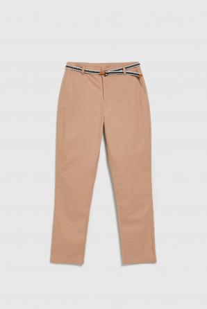 98% BAVLNA, 2% ELASTAN Hnědé dámské kalhoty bez vzoru jsou perfektní volbou pro ženy, které si cení pohodlí a stylu. Jsou vyrobeny z bavlny, poskytují příjemné nošení a skvěle padnou. Navíc mají praktické kapsy, ozdobný pásek a zip s knoflíky. Rovné dlouhé kalhoty se středním pasem budou dokonalým doplňkem šatníku každé ženy. Tyto kalhoty jsou ideální pro mnoho příležitostí, jak na každý den, tak do práce i na setkání s přáteli. Hodí se k mnoha různým šatníkům a lze je kombinovat s elegantní košilí nebo volným svetrem či halenkou. Díky své univerzální hnědé barvě budou vypadat skvěle jak s botami na podpatku, tak s teniskami.