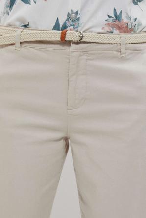 Světle béžové bavlněné kalhoty. Zapínání na zip a knoflík. Délka nohavice 7/8, dole přeložená. Kapsy na bocích, dvě klopy kapes na zadku. Ozdobný, úzký, splétaný pásek v ceně. Hladký, pružný materiál zajistí pohodlí při nošení. Musíte je mít, pokud máte rádi jednoduchý a snadný každodenní vzhled.