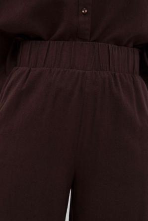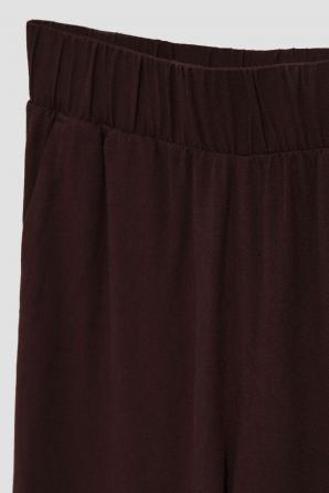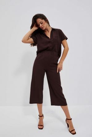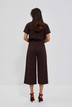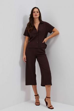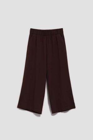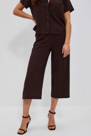 Dámské kalhoty culotte s volným střihem v atraktivním hnědém odstínu. Hladký materiál bez vzorů dodává kalhotám sofistikovaný vzhled. Široké nohavice v délce 7/8 a vysoký pas s elastickým pásem pro perfektní přizpůsobení vaší postavě. Tento model kalhot je ideální volbou pro horké letní dny nebo pro tu nejlepší dovolenou. Kalhoty jsou vzdušné a pohodlné, takže se v nich budete cítit volně a ležérně každý den.