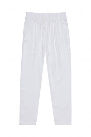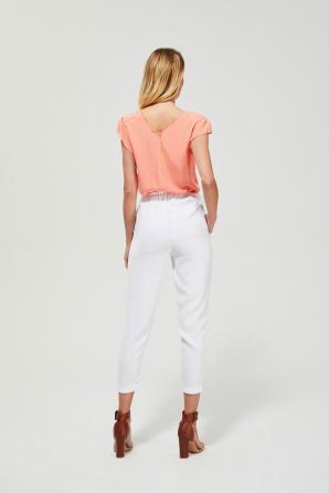Letní kalhoty z viskózy. Lehce zkosené nohy o délce 7/8 se záhybem. Kalhoty se zipem a knoflíkem. Vysoký pas s vlnitostí je jedním z hitů sezóny. Volný baggy střih je skvělou volbou pro teplejší dny. Bílá barva.