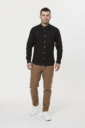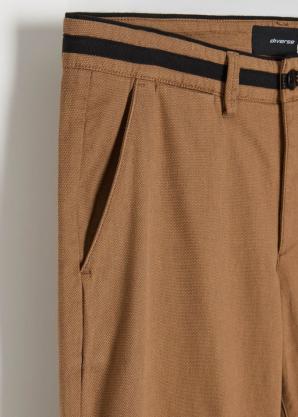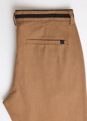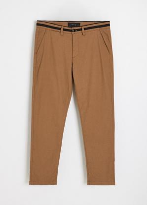 Pánské látkové kalhoty - přiléhavý střih, - dvě šikmé boční kapsy, - dvě laťkové kapsy vzadu, - ozdobná, kontrastní páska v pase, - zapínání na zip a knoflík.