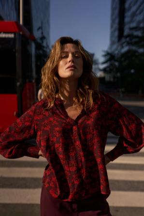 Viskózová vínová košile s květinovým vzorem