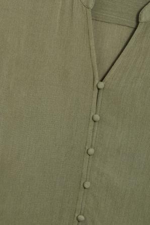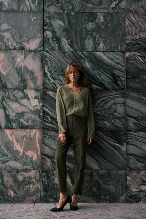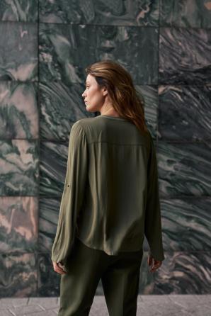 Tato dámská olivově zelená košile je ideální pro ty, kteří oceňují nadčasovou eleganci a pohodlí. Hladká textura, absence vzorů a klasický střih činí z tohoto kousku perfektní volbu pro současné dámské módní trendy. Lehkost a prodyšnost látky zajišťují celodenní pohodlí. Viskóza příjemná na pokožku umožňuje volné zapínání na knoflíky a neomezený pohyb. Praktické ohrnuté rukávy umožňují přizpůsobit si délku, zatímco výstřih do V decentně zvýrazňuje dekolt. Hodí se do práce, na neformální schůzky nebo na večerní vycházky a dobře se hodí k látkovým kalhotám, pouzdrové sukni nebo klasickým džínům. Perfektním doplňkem jsou mokasíny, kotníkové boty nebo jehlové podpatky.