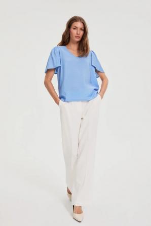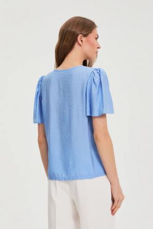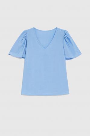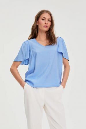 83% VISKÓZA, 17% POLYAMID Tato klasická modrá košile je ideální pro ženy, které si cení pohodlí a ženského stylu v každodenních situacích. Hladká, měkká viskóza jemně splývá s tělem a zajišťuje celodenní pohodlí. Krátké nabírané rukávy dodávají košili lehkost a zdůrazňují moderní charakter střihu. Výstřih do V zeštíhluje krk a zároveň zachovává všestranný styl. Tato košile je ideální jak do kanceláře, tak na neformální schůzky ve městě. Vytvořte si pohodlný look v kombinaci s vašimi oblíbenými džínami, cigaretovými kalhotami nebo rovně střiženou sukní. Pro elegantnější vzhled ji zkombinujte se sakem nebo s kardiganem pro ležérní vzhled. Ideální na léto, do práce, na procházku nebo na rychlý výlet s přáteli.