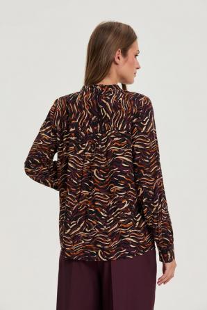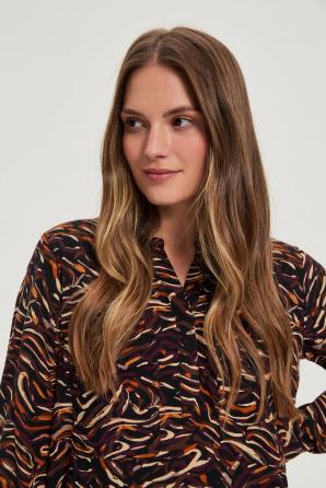100% VISKÓZA. Tato černá dámská košile s unikátním vzorem zaujme svou originalitou. Dlouhé rukávy poskytují pohodlí v chladnějších dnech, zatímco výstřih do V decentně zvýrazňuje krk. Lehká, vzdušná tkanina s přídavkem viskózy zaručuje pohodlí a příjemný pocit na pokožce. Ideální volba pro obchodní schůzky, rodinné oslavy nebo večery v restauraci. Tato košile se perfektně hodí ke klasickým látkovým kalhotám, pouzdrové sukni nebo slim fit džínům. Je to perfektní způsob, jak vytvořit elegantní vzhled s nádechem sofistikovanosti.