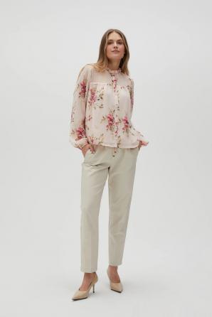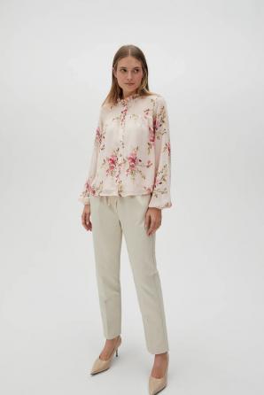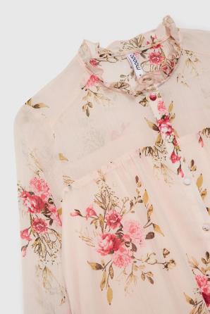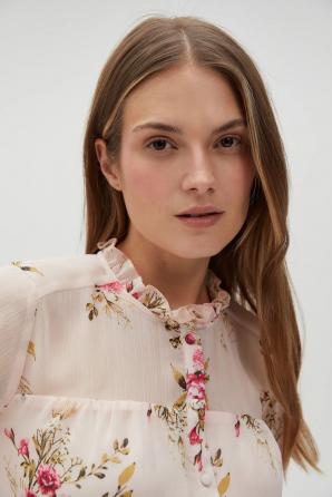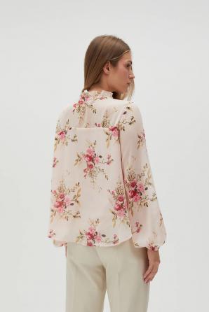 100% POLYESTER Košile v jemném růžovém odstínu se vzorem květů a listů. Jedinečné volánky, knoflíky a volánky dodávají eleganci a sofistikovanost. Záhyb a řasení na manžetě dodávají jemnost a ženský šarm. Ideální pro zvláštní příležitosti, jako jsou obchodní schůzky, večeře nebo rande. Skvěle se hodí k bílým kalhotám nebo elegantní sukni. Může být skvělým doplňkem kancelářského stylu.