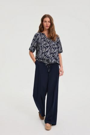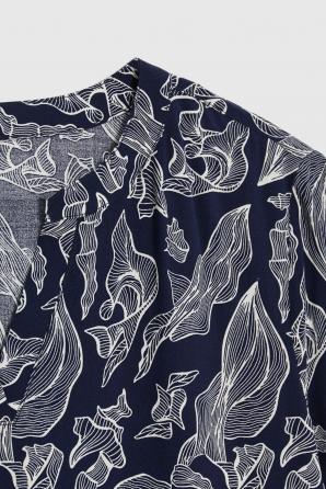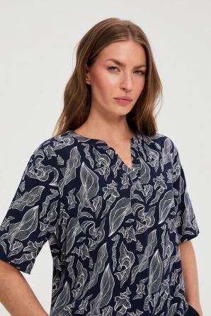 100% VISKÓZA Tato tmavě modrá košile s originálním vzorem je ideální pro ženy, které si cení pohodlí a stylu v každodenním životě. Lehká a vzdušná viskóza ji činí potěšením pro nošení i v ty nejaktivnější dny. Krátké rukávy, stojáček a ženský výstřih do V zdůrazňují její moderní charakter, zatímco decentní skladání a zavazování v pase jemně tvarují siluetu a dodávají jí lehký a uvolněný pocit. Střih bez límce umožňuje ležérní vzhled bez kompromisů v eleganci. Tato košile je ideální do práce, na odpolední schůzku nebo na procházku městem. Perfektně se hodí ke klasickým džínům, pouzdrové sukni nebo vašim oblíbeným cigaretovým kalhotám. Lze ji zkombinovat se sakem pro formálnější a zároveň ženský vzhled. Je to všestranná každodenní volba, která kombinuje pohodlí, módní střih a nadčasový styl, který se hodí k mnoha příležitostem.