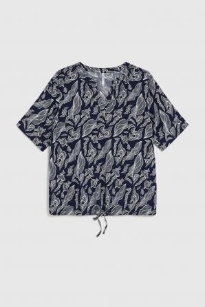 100% VISKÓZA Tato tmavě modrá košile s originálním vzorem je ideální pro ženy, které si cení pohodlí a stylu v každodenním životě. Lehká a vzdušná viskóza ji činí potěšením pro nošení i v ty nejaktivnější dny. Krátké rukávy, stojáček a ženský výstřih do V zdůrazňují její moderní charakter, zatímco decentní skladání a zavazování v pase jemně tvarují siluetu a dodávají jí lehký a uvolněný pocit. Střih bez límce umožňuje ležérní vzhled bez kompromisů v eleganci. Tato košile je ideální do práce, na odpolední schůzku nebo na procházku městem. Perfektně se hodí ke klasickým džínům, pouzdrové sukni nebo vašim oblíbeným cigaretovým kalhotám. Lze ji zkombinovat se sakem pro formálnější a zároveň ženský vzhled. Je to všestranná každodenní volba, která kombinuje pohodlí, módní střih a nadčasový styl, který se hodí k mnoha příležitostem.