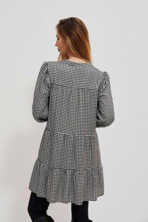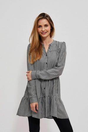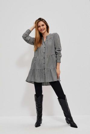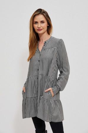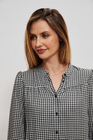 Rozevlátá dámská košile zdobená černobílým károváním. Kulatý výstřih zakončený jemným stojáčkem. Tři řady volánů, díky nimž košile krásně padne do písmene A. Dlouhé rukávy s jemnými nabírkami jsou zakončeny manžetou zapínanou na dva knoflíky. Na bocích všité kapsy. Zapínání na černé, malé knoflíky. Volný střih a délka tuniky dokonale ladí s černými vypasovanými kalhotami. Perfektní střih pro každodenní práci nebo pro zvláštní příležitost.