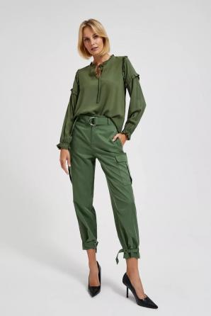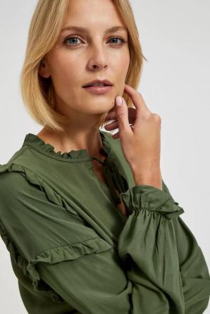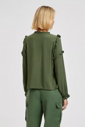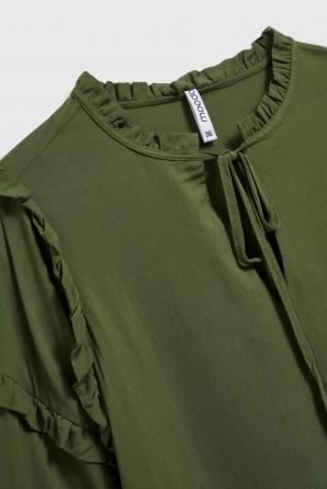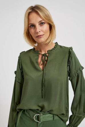 Khaki košile s volány na rukávech a zavazováním u výstřihu