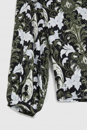 Tato dámská košile ze 100% viskózy v olivově zelené barvě zaujme svým decentním ornamentálním vzorem, který dodává vzhledu osobitý charakter. Klasický límec v kombinaci s moderním výstřihem do V zdůrazňuje krk a ramena a zajišťuje elegantní vzhled pro každou příležitost. Dlouhé rukávy jsou ideální jak pro chladnější dny, tak pro formální události. Lehká a vzdušná tkanina na bázi viskózy zaručuje pohodlí a hebkost. Ideální pro obchodní schůzky, rodinné oslavy nebo večerní výlety. Perfektně se hodí k elegantním látkovým kalhotám, pouzdrové sukni a klasickým džínům. Tato olivově zelená košile s ornamentálním vzorem je nezbytným kouskem v šatníku každé milovnice nadčasové elegance.