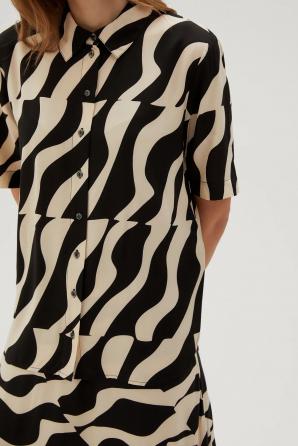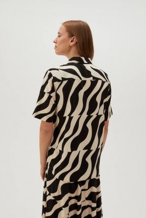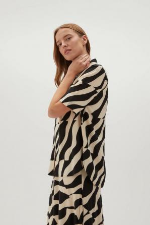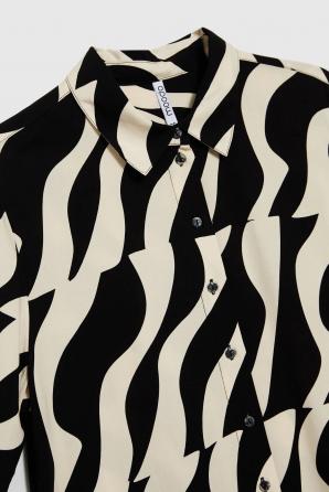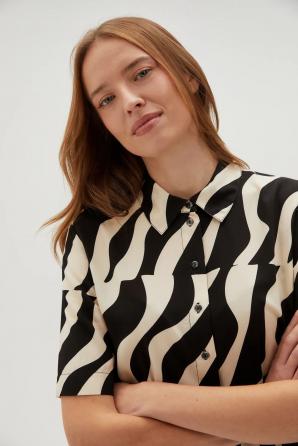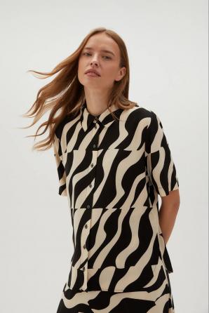 100% VISKÓZA Dámská košile v černé barvě s geometrickým vzorem je perfektní volbou pro ženy, které si cení stylu a pohodlí. Z lehké viskózy, zapínání na knoflíky, s krátkým rukávem a elegantním límečkem. Košile bude skvělou volbou pro mnoho příležitostí, jak do práce, tak na společenské akce. Skvěle bude vypadat jak k elegantním sukním, tak k džínům nebo látkovým kalhotám. Díky svému univerzálnímu designu se dá nosit jak každý den, tak při zvláštních příležitostech.