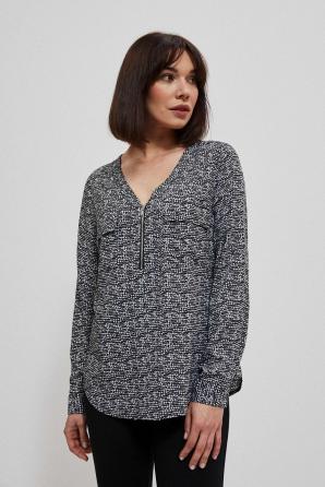 Černá viskózová košile. Na celku jsou docela velké bílé tečky. Rovný střih, kulatý lem, dlouhé rukávy. Výstřih do V. Ve výšce hrudníku dvě kapsy na přední straně. Mezi kapsami, pod výstřihem, je ozdobný stříbrný zip, kterým si nastavíte hloubku výstřihu.