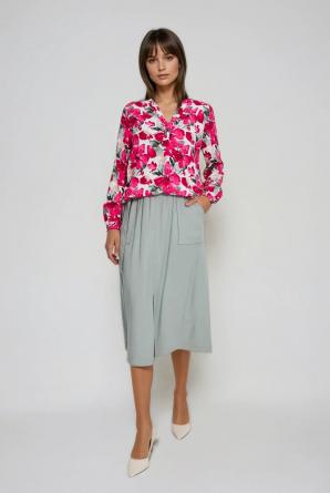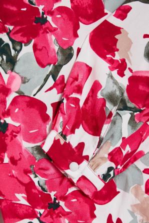 100% VISKÓZA. Tato fuchsiová košile s květinovým, botanickým vzorem je poutavá a každý den dodává energii. Vyrobena z měkké viskózy, je hebká na kůži a poskytuje celodenní pohodlí. Dlouhé rukávy s elegantními manžetami a výstřih do V zakončený stojáčkem zdůrazňují ženský charakter, zatímco ozdobné knoflíky dodávají nádech lehkosti. Tento kousek kombinuje stylový vzhled s každodenní volností pohybu. Tato košile je ideální do práce, na schůzky s přáteli i na procházky po městě. Skvěle vypadá s klasickými džínami, elegantními kalhotami nebo midi sukní. Lze ji nosit samostatně nebo pod sakem, čímž vytvoříte jedinečný, ležérní vzhled s nádechem elegance. Je to všestranná volba pro ženy, které se rády cítí pohodlně a stylově bez ohledu na příležitost.