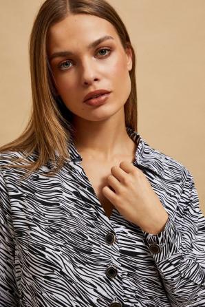 100% VISKÓZA Dámská košile je nenahraditelný kus oděvu, který zaujme svou elegancí a pohodlím. Vyrobeno z vysoce kvalitní viskózy, zaručuje nejen pohodlí při nošení, ale také odolnost a snadnou údržbu. Černobílý zvířecí vzor dodává košili charakter a vynikne v davu. Manžeta a límec jsou detaily, které zdůrazňují formální charakter košile a knoflíky jí dodávají kouzlo. Ideální volba pro mnoho různých příležitostí. Ideální pro obchodní jednání, rande nebo párty s přáteli. Košile se perfektně hodí k různým šatům. Můžete jej spárovat s elegantními kalhotami a sakem a vytvořit tak kancelářský vzhled. V kombinaci s džínami a kozačkami však košile vytvoří ležérní, ale přesto elegantní vzhled.