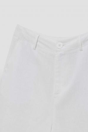 85% POLYESTER, 10% LEN, 5% BAVLNA Elegantní kraťasy v bílé barvě. Vysoký pas, velmi pohodlné na nošení. Krátké, rovné nohy, sahající do poloviny stehen. Zapínání na knoflík a zip v pase. Dodatečně všitá poutka na opasek. Ideální na léto v setu s halenkami nebo košilemi.