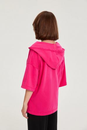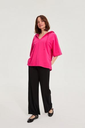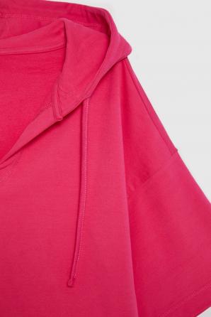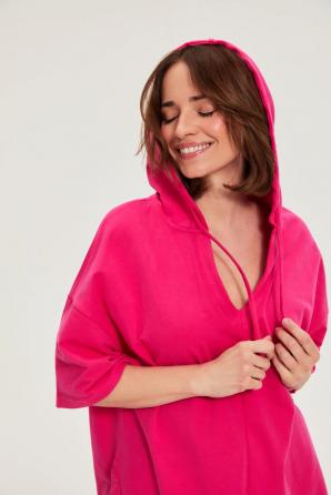 95% BAVLNA, 5% ELASTAN Tato zářivá fuchsiová mikina je ideální pro ženy, které si cení pohodlí s moderním nádechem. Měkká bavlněná tkanina obepíná pokožku, takže se v ní budete cítit pohodlně po celý den, zatímco oversized střih dodává každému outfitu nádech lehkosti. Krátké rukávy, praktická kapuce a boční rozparky dodávají sportovní nádech a zároveň zdůrazňují ženský styl. Tento jednoduchý střih s výstřihem do V dokonale doplní váš každodenní šatník. Ideální pro náročný den – je ideální do kanceláře, na procházku městem, na schůzku s přáteli nebo na rychlou kafe. Mikina se snadno kombinuje s vašimi oblíbenými džínami, midi sukní nebo sportovními legínami. Je to pohodlná volba pro ležérní outfity, kde je klíčové pohodlí a módní styl.