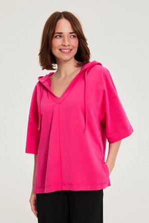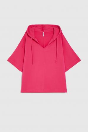 95% BAVLNA, 5% ELASTAN Tato zářivá fuchsiová mikina je ideální pro ženy, které si cení pohodlí s moderním nádechem. Měkká bavlněná tkanina obepíná pokožku, takže se v ní budete cítit pohodlně po celý den, zatímco oversized střih dodává každému outfitu nádech lehkosti. Krátké rukávy, praktická kapuce a boční rozparky dodávají sportovní nádech a zároveň zdůrazňují ženský styl. Tento jednoduchý střih s výstřihem do V dokonale doplní váš každodenní šatník. Ideální pro náročný den – je ideální do kanceláře, na procházku městem, na schůzku s přáteli nebo na rychlou kafe. Mikina se snadno kombinuje s vašimi oblíbenými džínami, midi sukní nebo sportovními legínami. Je to pohodlná volba pro ležérní outfity, kde je klíčové pohodlí a módní styl.