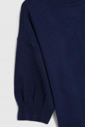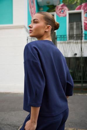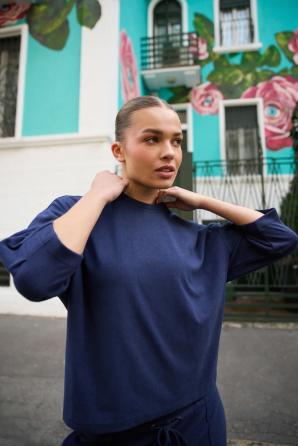 95% POLYESTER, 5% ELASTAN Tato oversized mikina v tmavě modré barvě je ideální pro ženy, které si cení pohodlí a stylu. Jemná, hebká tkanina obepíná siluetu, aniž by omezovala pohyb, zatímco decentní řasení na tříčtvrtečních rukávech a módní nabrané rukávy dodávají mikině nádech lehkosti a ženskosti. Hladká textura a kulatý výstřih zdůrazňují moderní, minimalistický vzhled, díky čemuž je ideální do práce, na odpolední procházku nebo na setkání s přáteli. Tato tmavě modrá mikina je perfektním základem pro každodenní outfity – dobře se hodí ke klasickým džínům, pohodlným látkovým kalhotám nebo ženské sukni. Lem u výstřihu dodává mikině jemný závěrečný nádech a oversized střih vám umožní cítit se pohodlně po celý den. Díky své všestrannosti je mikina perfektním doplňkem k ležérnímu, ale zároveň elegantnímu stylu a nabízí pohodlí, které nemusí být obětováno kvůli módnímu vzhledu.
