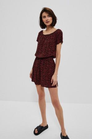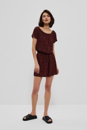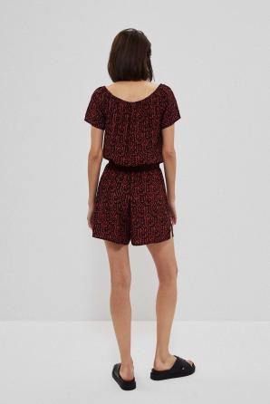 Stylový overal s krátkými rukávy a nohavicemi. Červená barva. V pase lem se zavazováním zdůrazňuje siluetu. Lodní výstřih. Příjemný viskózový materiál. Originální, černý vzor na celku. Skvělá alternativa k šatům v teplých dnech.