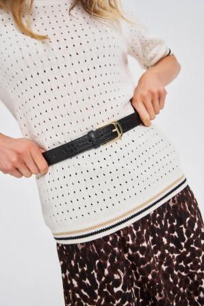 100% POLYURETAN Tento černý dámský pásek se zvířecím motivem a ozdobnou zlatou sponou je perfektním způsobem, jak dodat vašemu outfitu jedinečný nádech. Módní vzor na povrchu a elegantní akcenty v podobě třpytivé spony přitahují pozornost a zdůrazňují váš individuální styl. Materiál – ekokůže s nádechem polyuretanu – zajišťuje odolnost a pohodlí, zatímco precizní povrchová úprava zaručuje dlouhodobý a atraktivní vzhled.