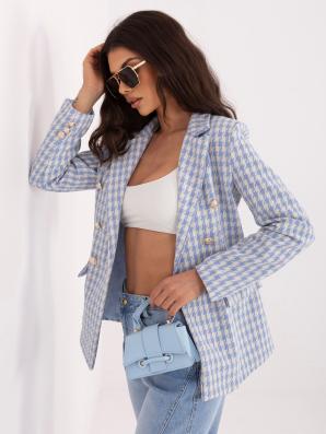 Dámské dvouřadé sako s podšívkou; všité ramení vycpávky, vzor kohoutí stopa, v barvě světle modré