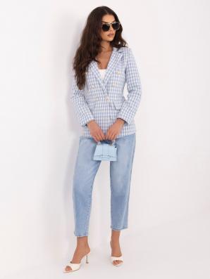 Dámské dvouřadé sako s podšívkou; všité ramení vycpávky, vzor kohoutí stopa, v barvě světle modré